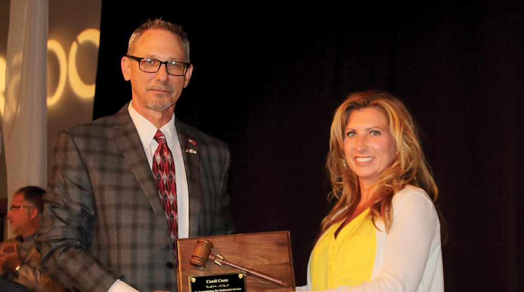 Dave Edmondson, J&M Tank Lines and incoming Tank Truck Safety & Security Council chairman, presented a plaque to Candi Coate, K-Limited Carrier Ltd, in appreciation for her service as Tank Truck Safety & Security Council chairwoman for the past year.